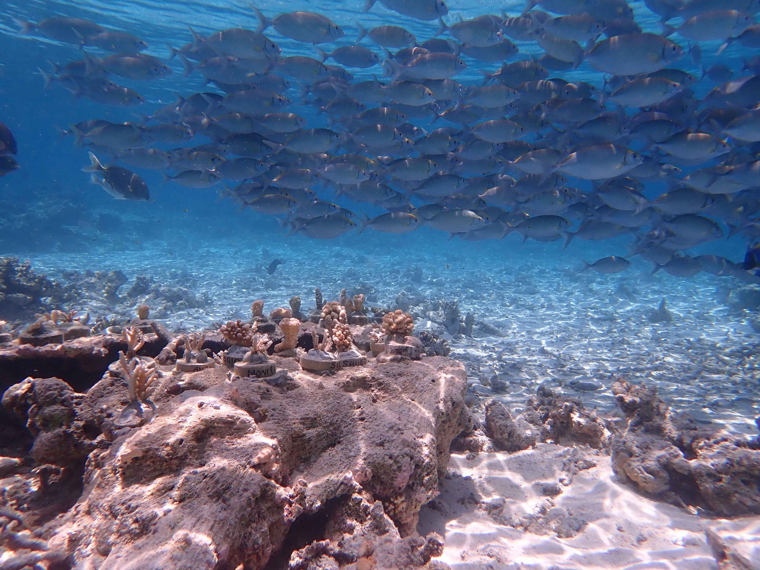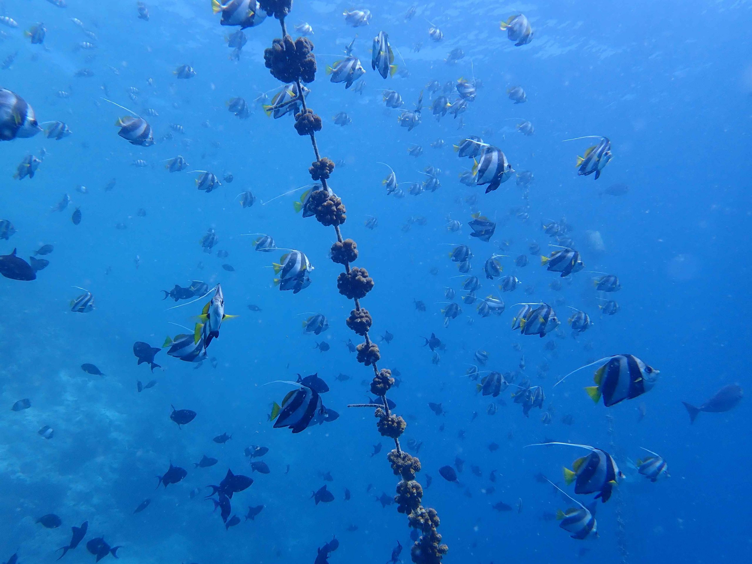 Restoring coral reefs requires knowledge, planning and scale. Therefore, the Marine Biology team has established the first mid-water coral nursery on Bathala to test and, in a second step, expand coral production to repopulate the reef. This technique, known as coral gardening, is a two-step process where coral fragments are grown under ideal conditions in the nursery before they have reached a suitable size for out planting on the reef. This allows the production of thousands of new corals within a year that will have a higher chance of survival on the reef. To test and finetune the process, the biologists are closely monitoring the progress of corals growing on “Bathalantis”.