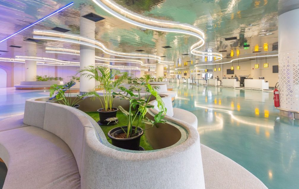 Situated next to the Arrival gate, the counters provide a spacious, air-conditioned environment designed for passenger comfort. The area features indoor greenery and seating arrangements that create a relaxed and comfortable atmosphere for passengers.