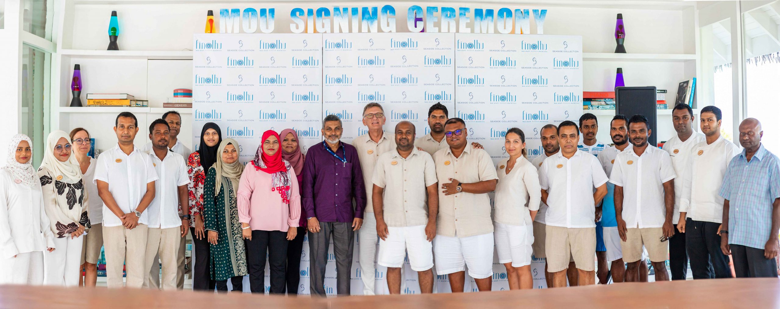 Key figures from both organizations, including Dr Ali Fawaz Shareef, Deputy Vice Chancellor, Ms Zeenath Solih, Dean of FHTS, Mr Steven Phillips, General Manager of Seaside Finolhu Maldives, Mr Matheen Faisal, Human Resource Manager of Seaside Finolhu Maldives, Mr Eranga Bandara, Talent Development Manager of Seaside Finolhu Maldives and team members of both Seaside Finolhu Maldives and The Maldives National University attended the signing ceremony.