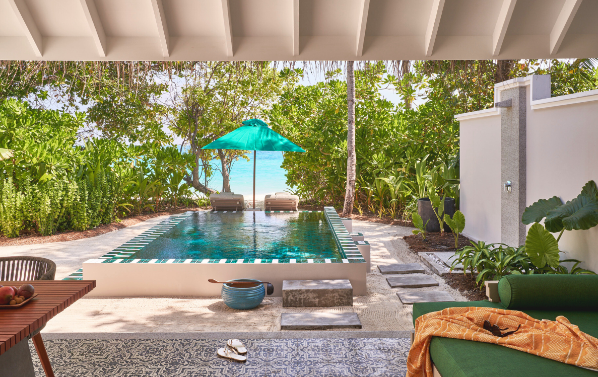The 735m² connecting villa option is comprised of two beach villas with a pathway seamlessly linking the two. It can accommodate six adults and four children in total or up to nine adults, featuring ocean views, a private garden and a pool. Guests can enjoy direct beach access as well as an outdoor rain shower.