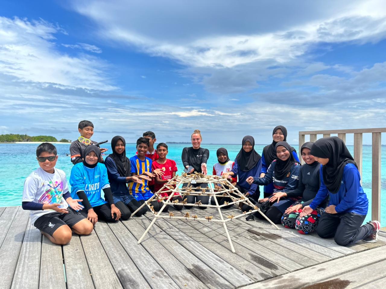 After the awareness session, the students had the opportunity to participate in a hands-on coral planting activity. Under the guidance of experts from Reefscapers Maldives, the students planted coral fragments on metal frames covered in sand, providing a medium for the coral to grow and thrive. This event marked the planting of the 400th coral frame since the initiative was established in 2020, resulting in over 27,000 fragments being planted and growing beautifully around the resort’s underwater environment.