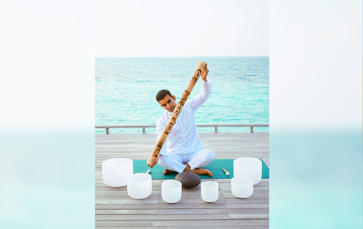 Group activities include sunrise and sunset yoga, partner yoga for couples and families, pool workouts, floating sound meditation, glow in the dark aerial yoga, and candlelit meditation.