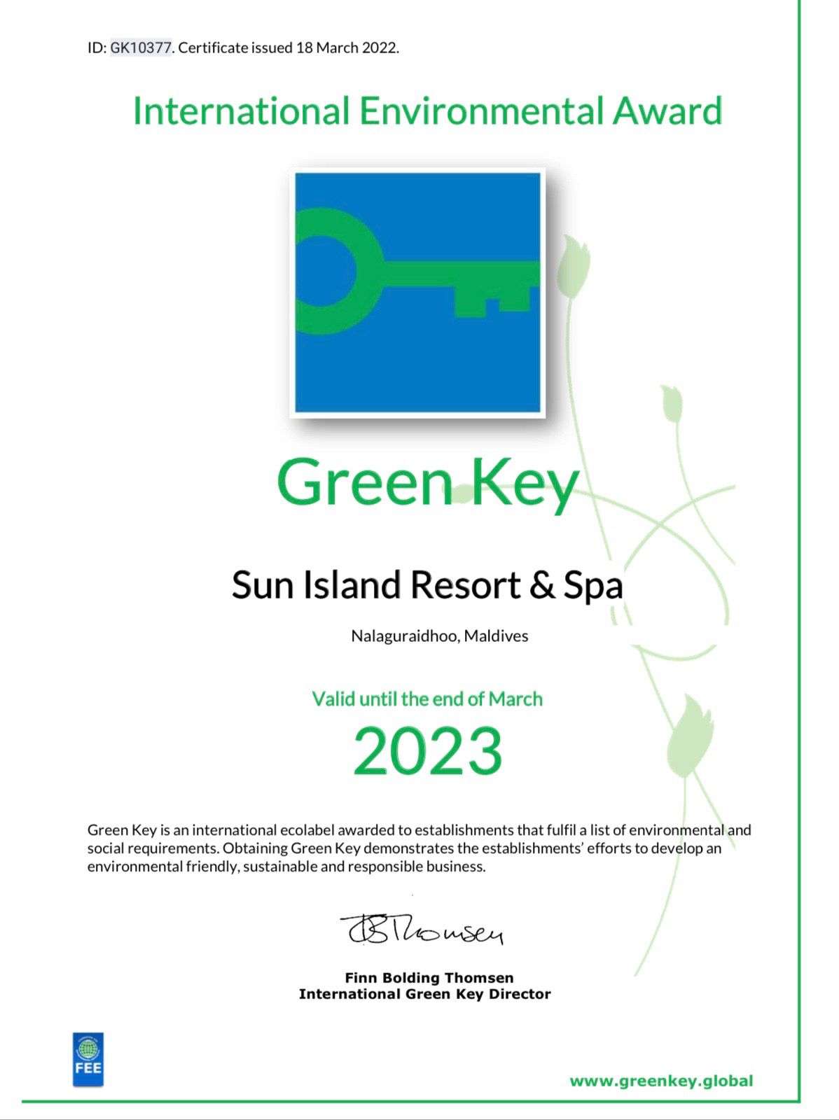 Sun Island Resort & Spa has won the prestigious international environmental award, Green Key award. The Green Key is an international eco-label awarded to businesses that fulfill a list of environmental and social requirements. Winning Green Key demonstrates the business’s efforts to develop an environmentally friendly, sustainable and responsible business.