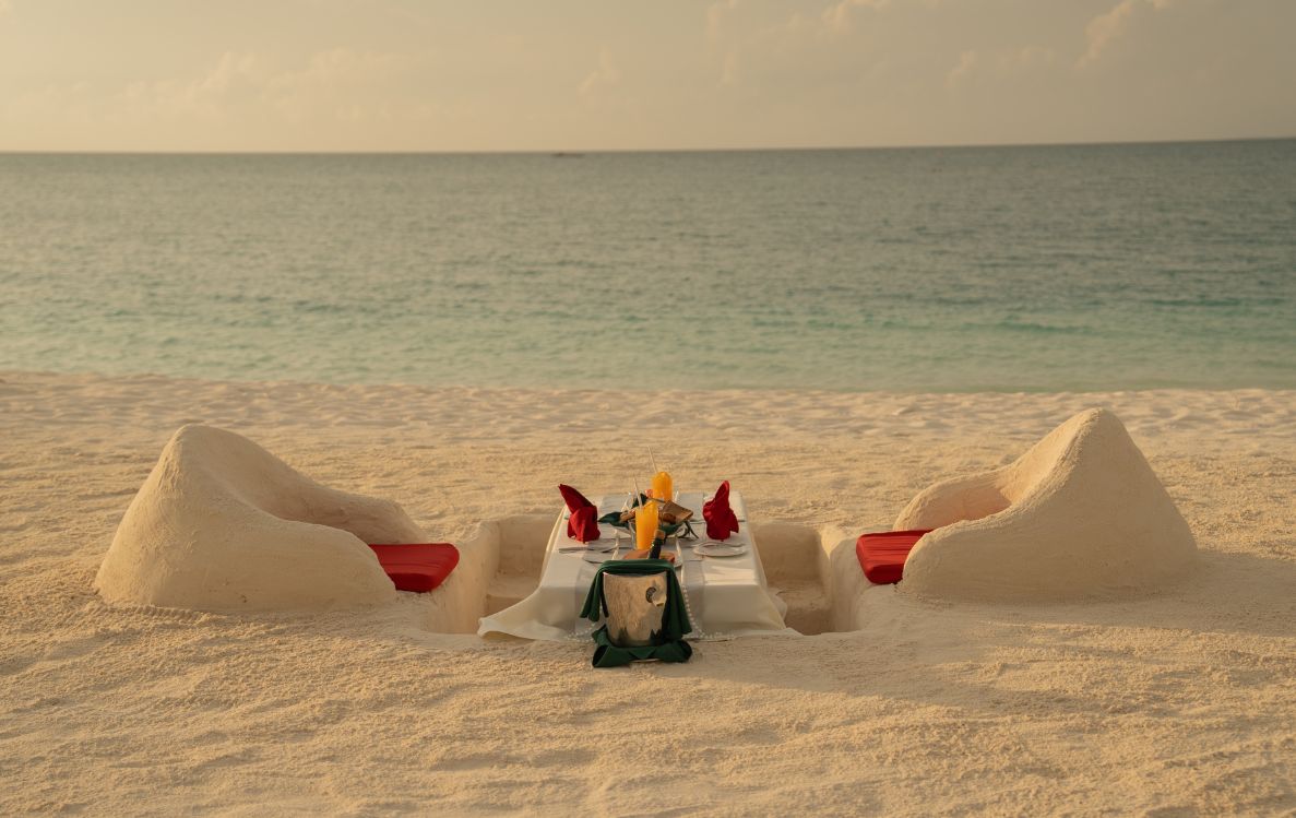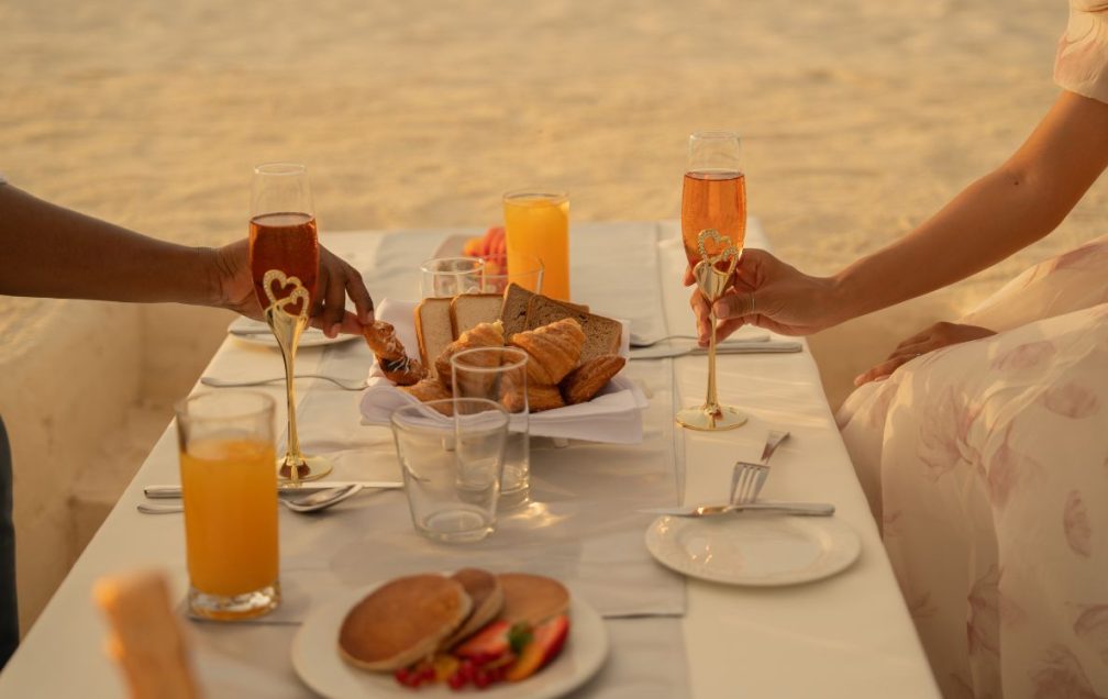 The newly introduced Sunk in Sand Dining Experience was officially unveiled during the Valentine’s celebrations, beginning with a beachfront breakfast concept. Guests can begin their day with a curated breakfast served directly on the shoreline, seated within the sand itself with uninterrupted views of the horizon. Complemented by a bottle of sparkling wine, the experience offers an intimate setting surrounded by the natural beauty of the Maldivian coastline.