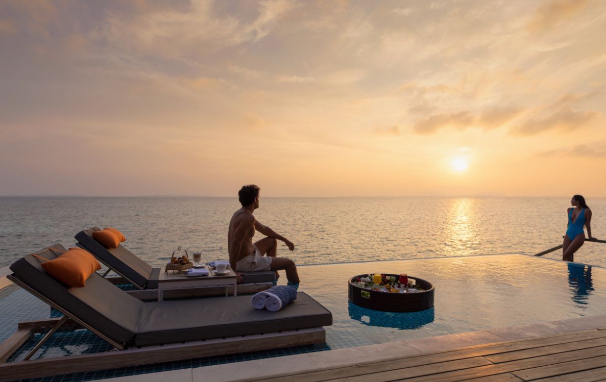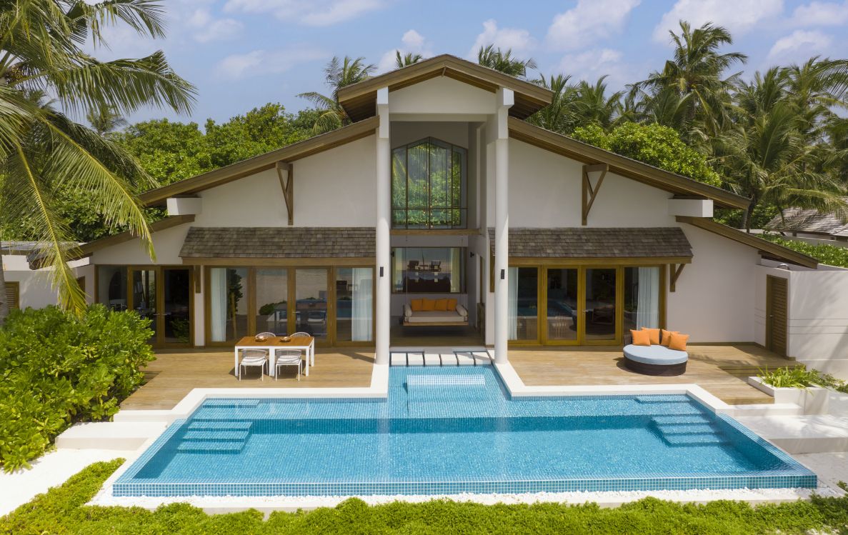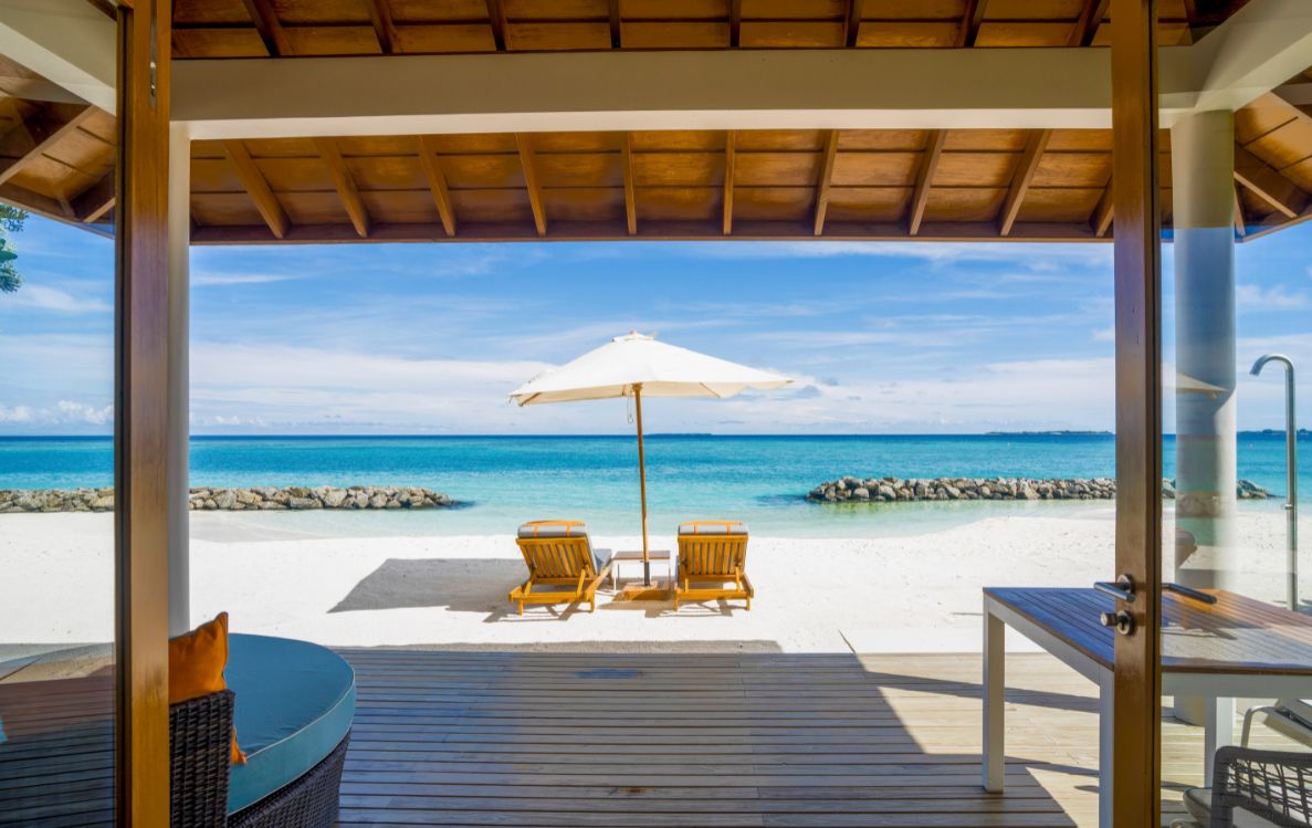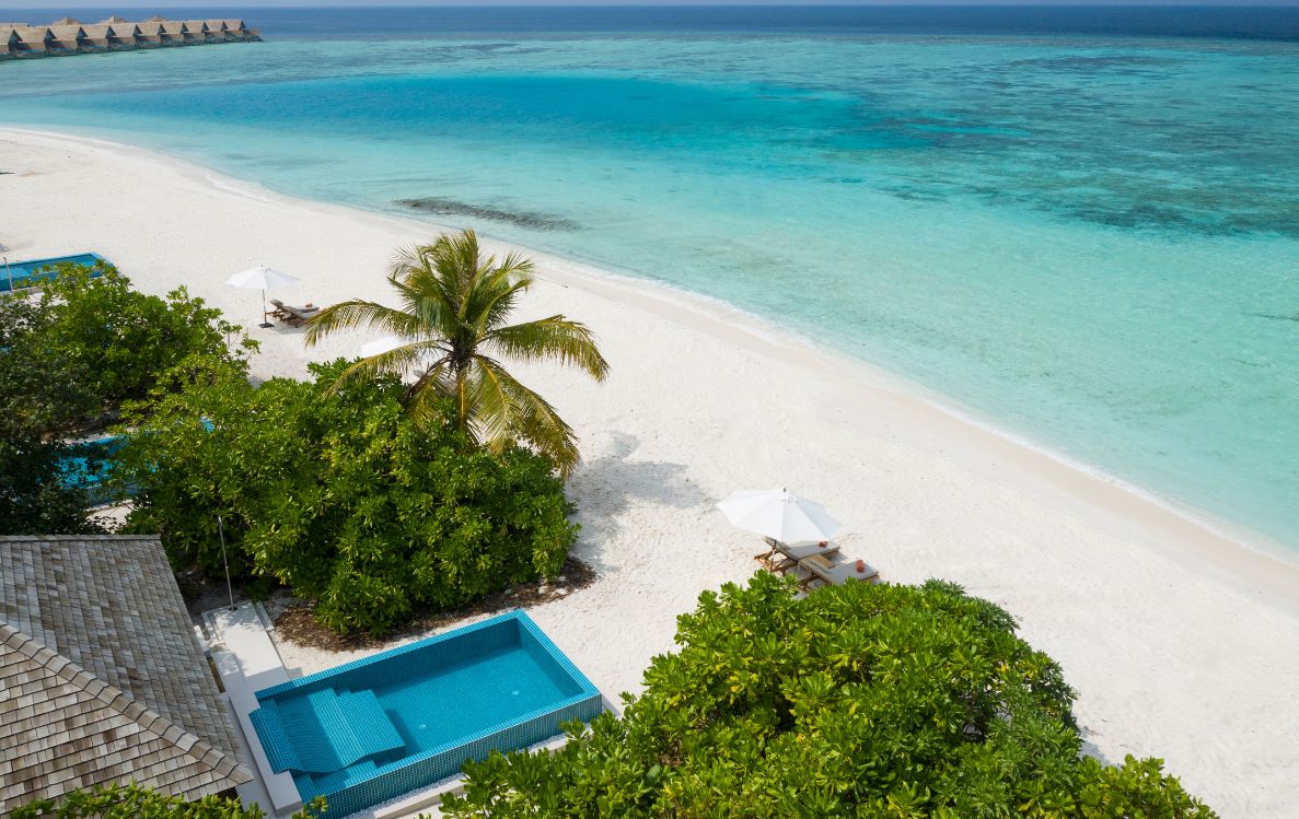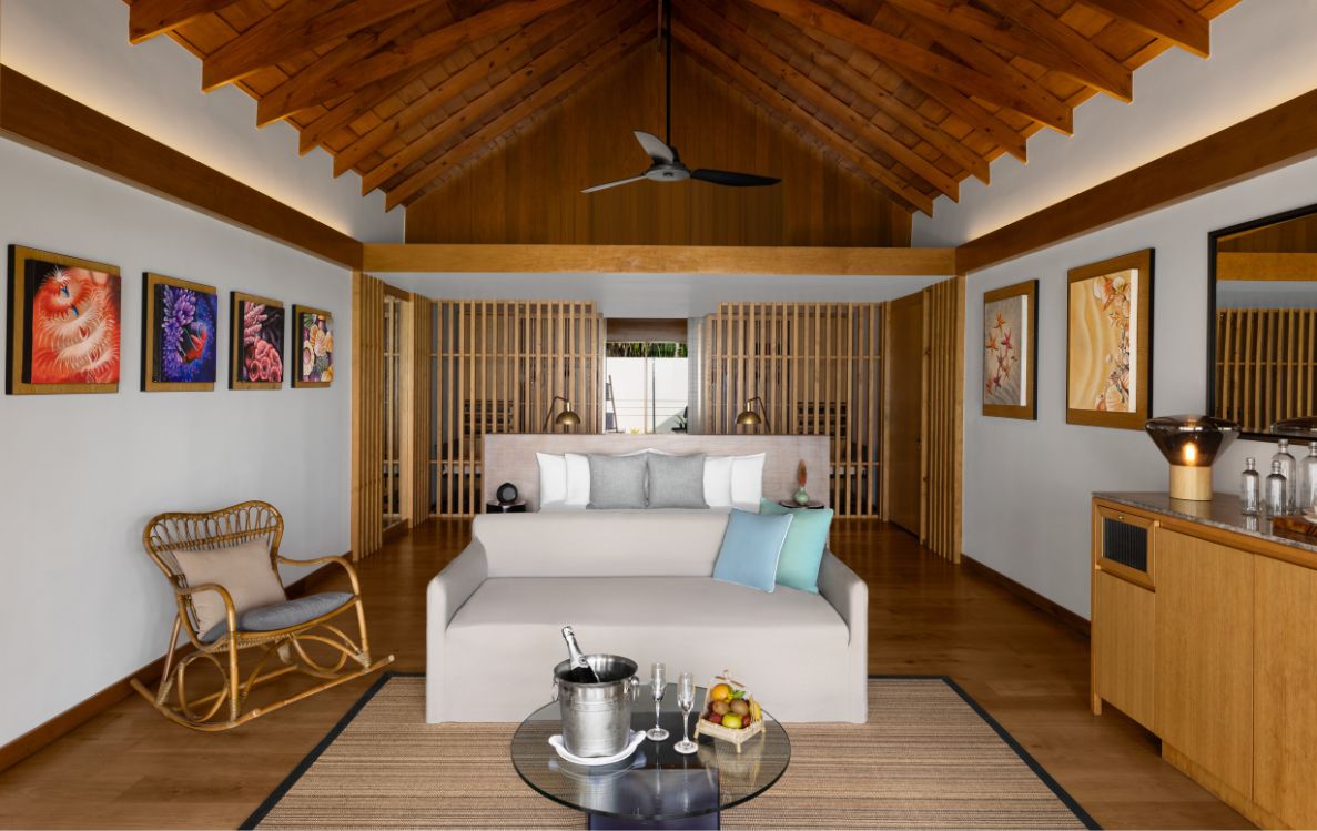 Further along the island, the Beach Villas with Pool expand that sensation. At 172 square metres, with vaulted ceilings and floor to ceiling windows, they are built to draw the horizon into the room. The private plunge pool sits between villa and sea, a pool of stillness before the open water. In the early morning, when the sunlight begins to move across the sand, the villa feels like a lens directing attention outward toward the changing colours of the lagoon.