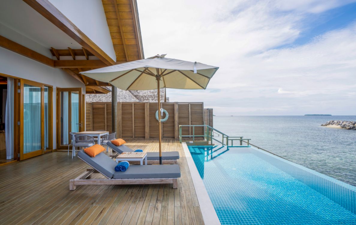 At the far end of the jetty, where the lagoon seems to widen and the breeze carries a different kind of salt, the Superior Water Villas with Pool sit in a small cluster of their own. Only a few exist. These 230 square metre villas open into expansive wooden floors, a long ten metre infinity pool and direct access to the lagoon. Snorkelling gear rests ready beside the deck, an invitation to step into the water with no hesitation. There is an in room dining space, a walk in closet and an IDD cordless telephone, but the experience is anchored by the surroundings rather than the amenities.
