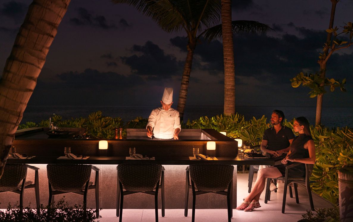 For guests seeking something more theatrical, IWAU offers a Japanese dinner under the stars. A limited number of seats and a chef-led approach make it intimate and expressive, almost like watching a performance with the ocean as the backdrop. Each course arrives with precision, focusing on the purity of the ingredients, from pristine sashimi to elegantly grilled meats, balanced with sake or champagne chosen to enhance the subtleties of the cuisine. The experience feels distinctly Maldivian, yet rooted in Japanese craft.