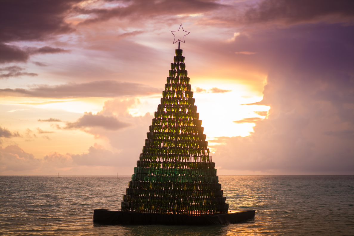 The 30ft high Christmas tree is built using over 2400 recycled champagne bottles. It took 18 days of passionate building to create this engineering feat – the tallest floating tree of the year in the Maldives!
