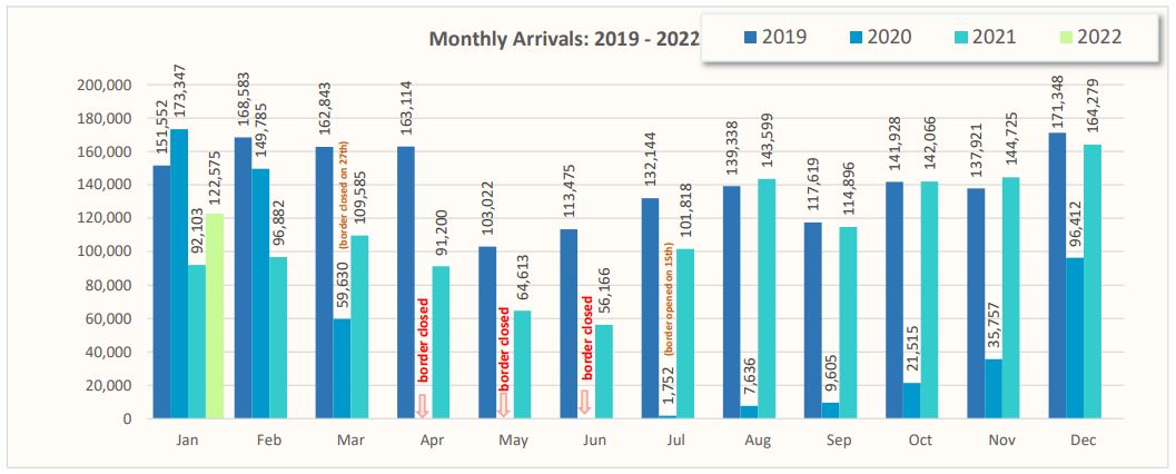 Maldives has recorded a total of 122,575 tourist arrivals during January 2022.