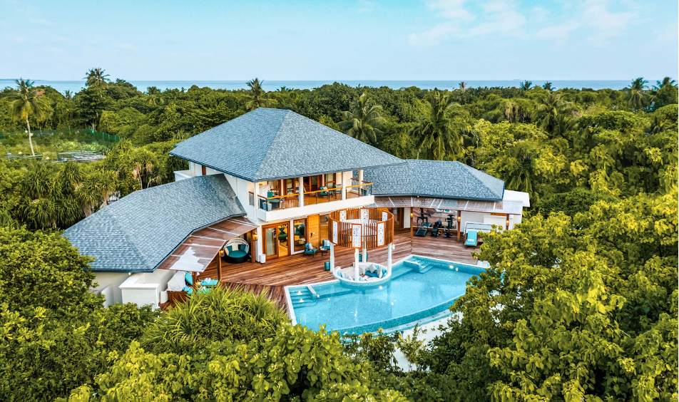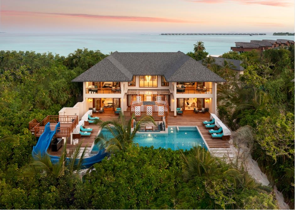 The four-bedroom villa has private bedrooms and a separate nanny room, each with a standalone suite and a walk-in rain shower. The distinctive water slide feature that extends into the scintillating and ostentatious swimming pool with a Gazebo is a truly unique concept in the Maldives. The enthralling outdoor wooden deck features a luxurious living area with plush sunbeds and designer couches. The spacious interior living space and large outdoor relaxation area make this residence ideal for families and groups who value their privacy and space. Some special features unique to this villa category are an indoor gym, a steam room, and a study room.