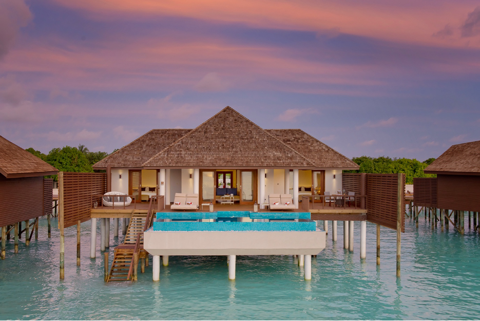 The Two-Bedroom Ocean Villa with Pool is your very own family hideaway. These double luxury villas are places for couples to relax and unwind together, as well as a luxurious setting for creating memories that will last a lifetime. With two elegantly furnished bedrooms, two bathrooms, and an expansive veranda with an infinity pool, the villas are perched on stilts above the turquoise lagoon.