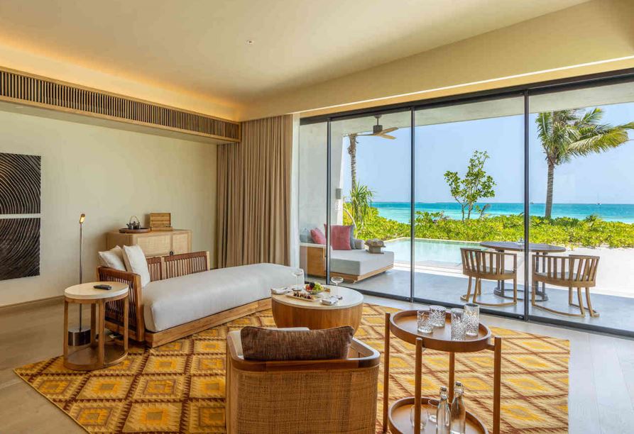 Take a dip in the pool right outside your room with complete privacy as you overlook the beautiful crystal clear waters of the ocean. This room calls out for everyone who is craving a private and intimate beach holiday experience.