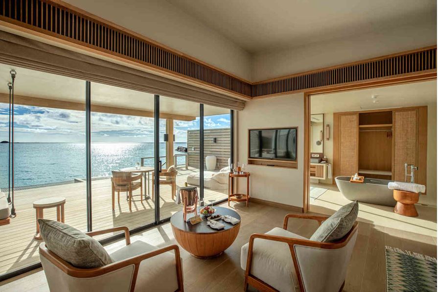 These villas on top of the cerulean sea will allow you to wake up to the gentle sound of the waves. Lounge in your villa and enjoy the mesmerizing views as the ocean breeze flows in and out of the room. The villas feature king-sized beds, spacious bathtubs, shaded dining decks overlooking the horizon, and spacious living areas.