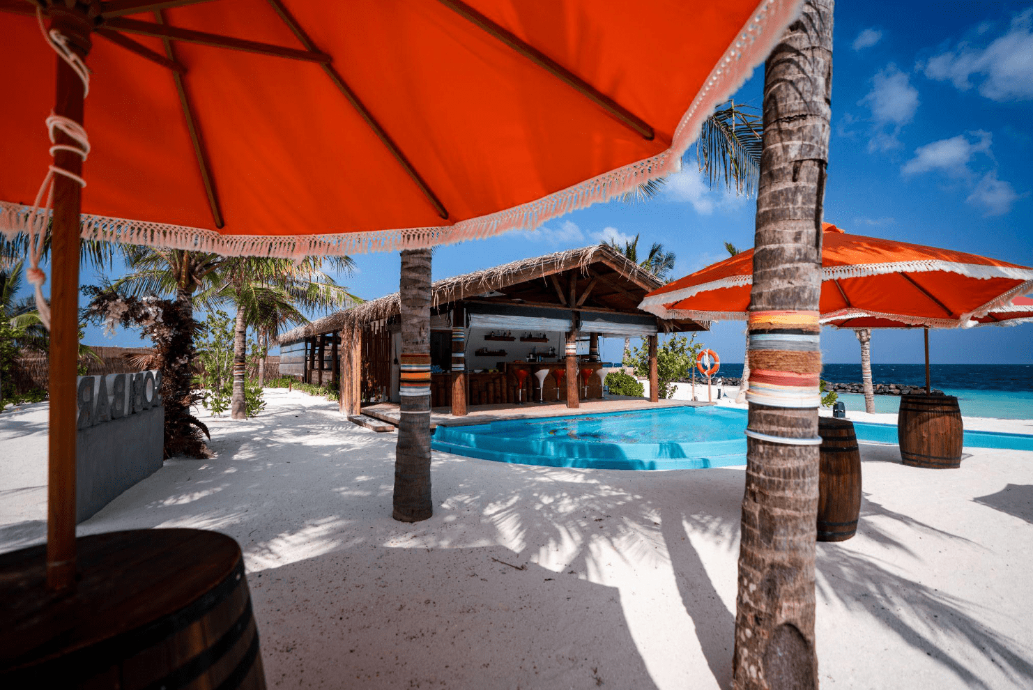 The main bar and pool area at Oaga Art Resort exudes a lively and energetic vibe, where guests can enjoy a range of Japanese-inspired snack options such as sushi and tempura. Guests are encouraged to take a dip in the largest hand-painted mural pool in the Maldives or join the fun in the party pods, where pool parties are elevated with the addition of Maldivian ‘bodu beru’ beats.