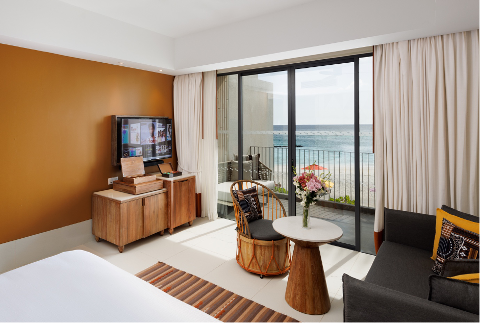 For a touch of luxury and ocean views, the Gold Beach Villa is the ideal choice. After dropping off your shopping bags from The Marina @ CROSSROADS, you can head straight to your chaise lounge chair and enjoy the serenity. The villa includes a sofa bed, an ensuite bathroom with double vanity sinks, and a high-walled bathtub.