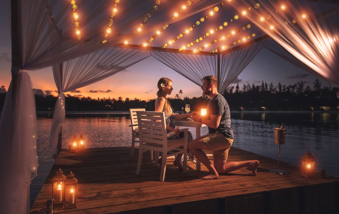At Sun Siyam Olhuveli, the Floating Platform Dinner offers a one-of-a-kind romantic experience that combines intimate dining with the serene beauty of the Maldives. Whisked away to a private platform floating in the heart of the lagoon, you’ll be surrounded by nothing but the calming sounds of water and the soft glow of candlelight. The From LAND and From SEA menus, crafted with the finest ingredients, allow you to indulge in a gourmet journey that captures the essence of both the ocean and the land. As the gentle sway of the platform adds an extra layer of tranquillity, this magical experience is perfect for those seeking a truly unforgettable evening. This intimate dining experience goes beyond just a meal – it’s a journey into serenity and timeless romance. The platform drifts gently across the lagoon, immersing you in the serene splendour of the Maldives.