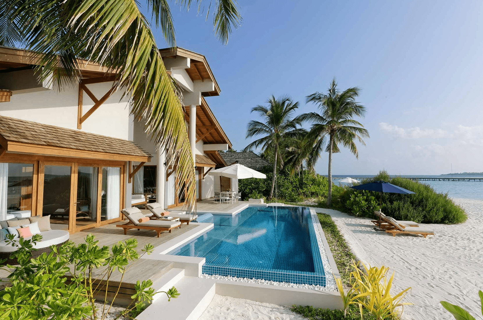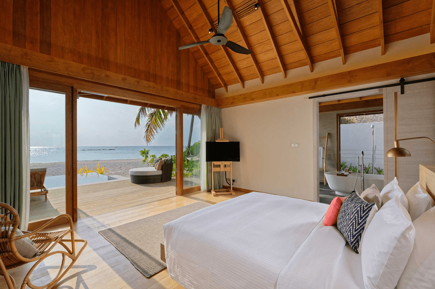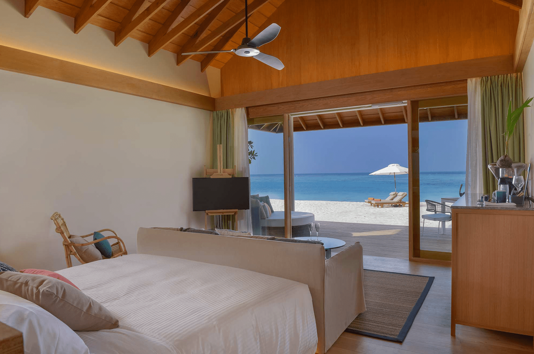 It has two bedrooms, each with a private bathroom, a walk-in closet in the master bedroom, a separate mini-bar room, two outdoor gardens with showers, a private jacuzzi, and a large patio with an outdoor dining area, sundeck, and a private pool measuring 12 x 5 meters that is directly facing the sea. It is situated in a prime location on the island and is surrounded by Faarufushi’s lush garden.