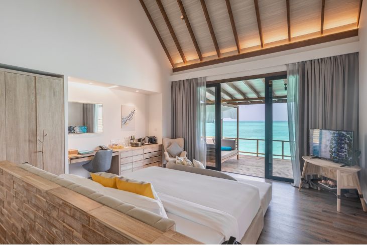 With traditional Maldivian craftsmanship and modern design interiors, the thatch-roofed water villas are perched on top of wooden stilts and have a romantic outdoor Jacuzzi with views of the crystal-clear lagoon. Take a dip in the azure waters and enjoy relaxing under the sun on your private deck.