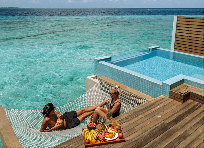 As the sun sets, take in the uninterrupted ocean views from your private water villa with a plunge pool. You can fully take in the blue ocean from your private pool thanks to a glass front panel. On the deck, relax beneath the four-post cabana or cool down by jumping off into the turquoise lagoon.