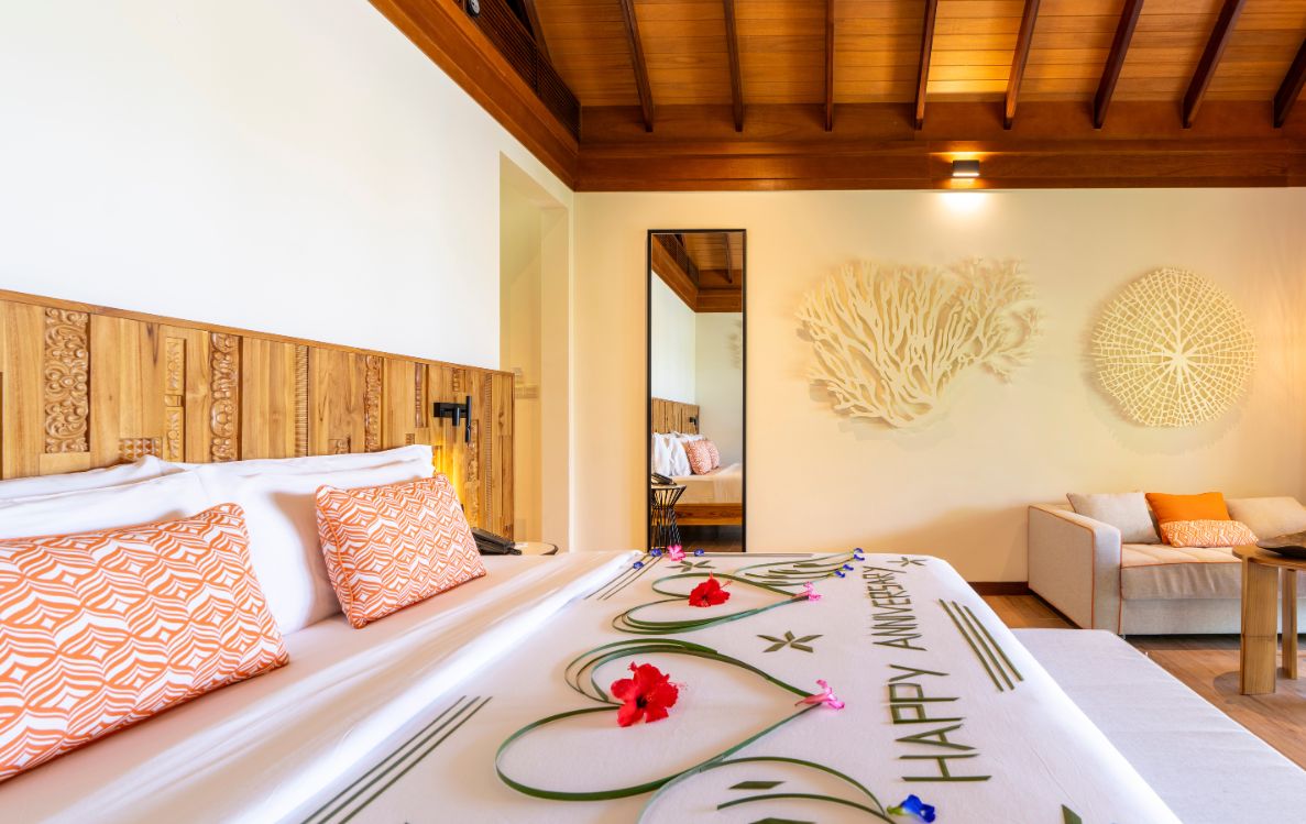 The Sunset Water Villas sit gracefully over the shimmering lagoon, providing guests with sweeping views of the horizon. Each villa boasts 85 m² of space, featuring a luxurious bathroom with direct access to a private terrace. Guests can soak in stunning sunset views from their sun loungers or venture straight into the lagoon with easy access from the villa’s stairs.