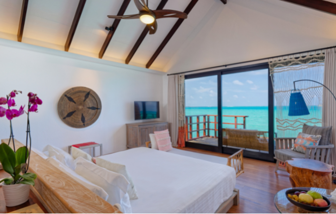 The private villa is one of the finest Maldives overwater villas, set amidst a tranquil crystal-clear lagoon facing north of the island, perfect for a dip or swim around the shallow seas on the island. You can relax on the spacious private sun deck or lie on the Maldivian hammock and soak up the sun. `
