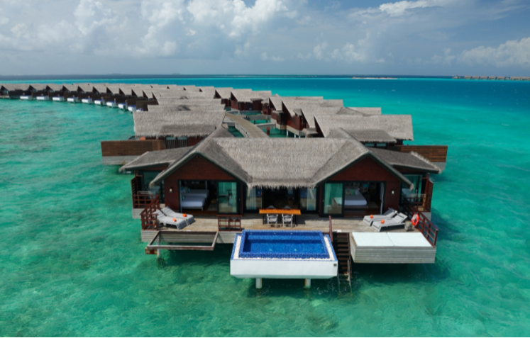 The luxurious one-island, one-resort getaway features 120 Maldives villas with breathtaking views and sumptuous in-room amenities. All of the beach, lagoon and ocean villas have wonderful tropical views and 65 of them have private pools. The resort features elegant architecture and contemporary exteriors with Maldives’ traditional influence of wood and rattan, innovative rustic appeal, and inviting serene ambience, designed by award-winning hospitality firm Hirsch Bedner Associates.