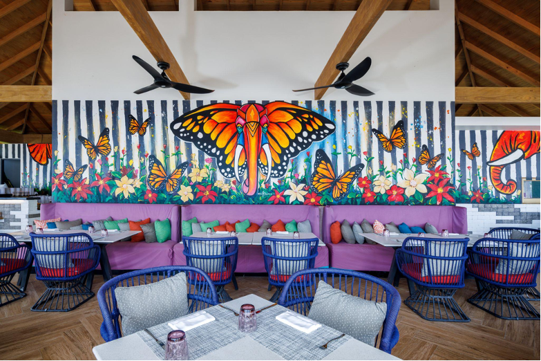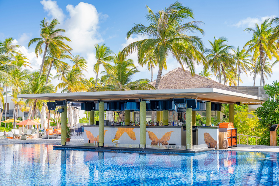 The Pool Bar at Hard Rock Hotel Maldives is the perfect spot to relax and enjoy the tropical paradise, with its sparkling infinity pool and iconic purple slide. With underwater stools and tunes, guests can enjoy their favourite drinks while staying cool in the refreshing water. The bar also offers a special menu for kids, making it a great spot for families.