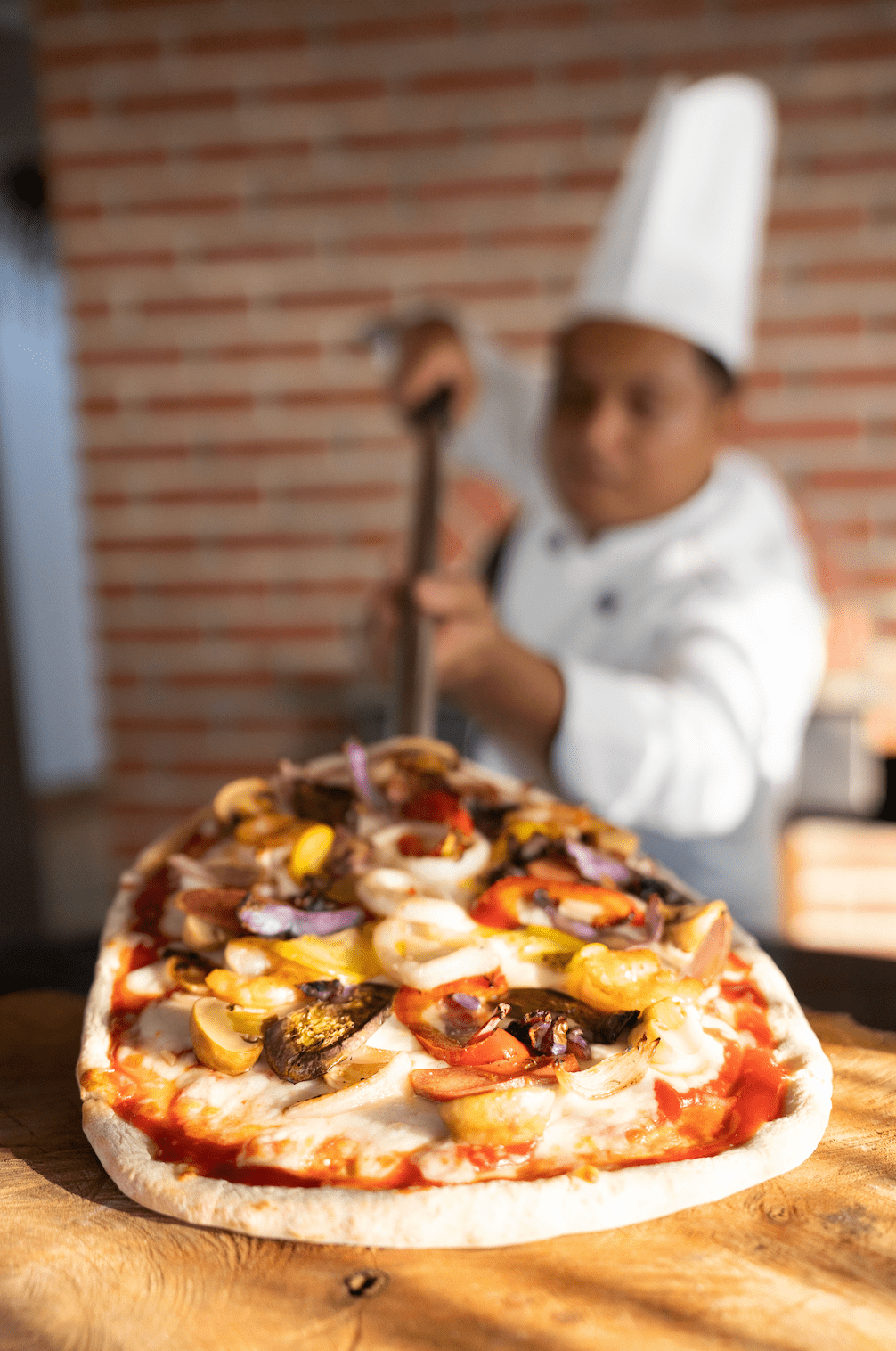 With a little twist — made fresh and baked in a stone oven, pizza by the metre right next to the pool overlooking the ocean is available for an afternoon delight.