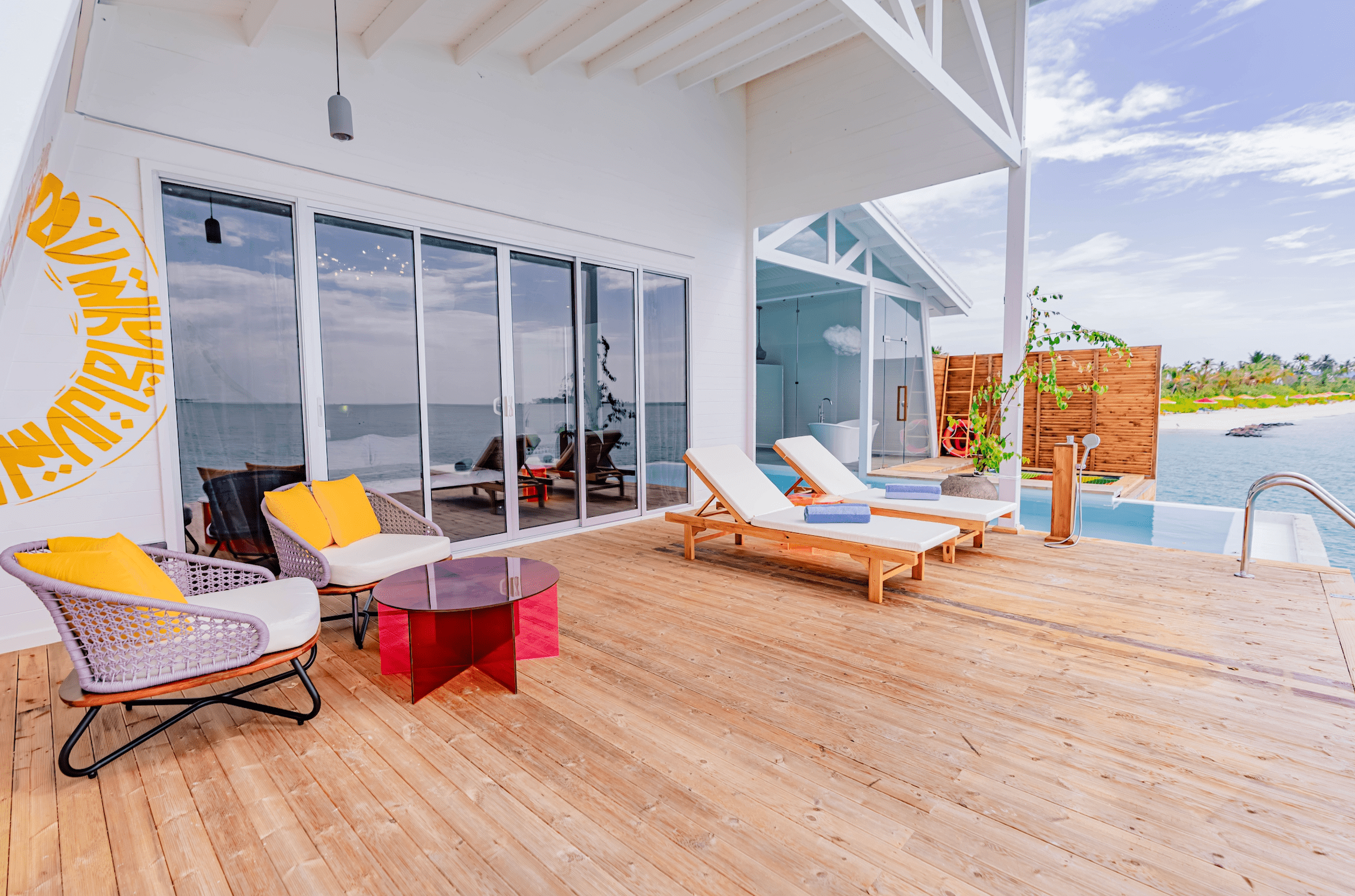 “Sail to serenity where luxury floats on crystalline waters” is the promise of Odi Water Villas. Drawing inspiration from the legends of the first settlers of the Maldives, these villas are a tribute to the Dheyvis and the tale of Koimala, the visionary who sailed to inhabit Male’. The opulence of gold accents and modern amenities merge seamlessly with ancient island royalty. Sunbeds, a hammock area and a standalone tub complete the experience. Plus, the thrill of a huge slide welcomes you into your vacation at Oaga. The resort offers family water villa categories for two adults and two children, subject to availability.