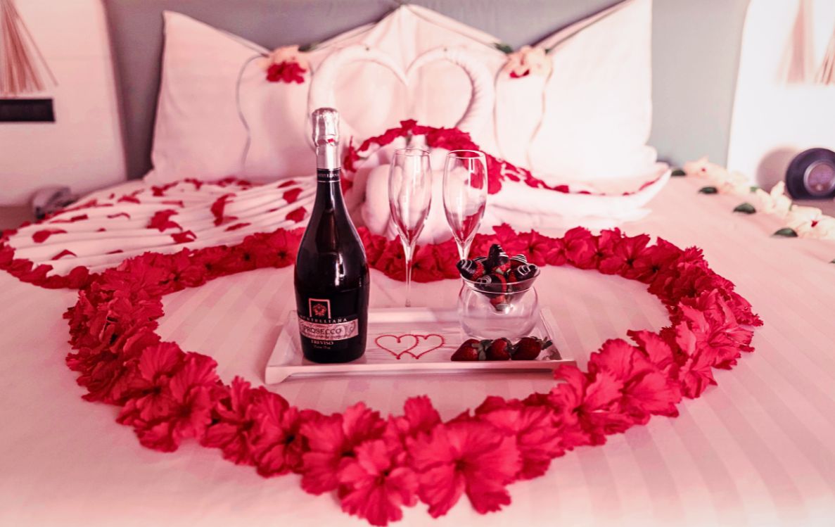 Couples can enjoy a Romantic Dinner Under the Stars on Ahima Beach, complete with a four-course gourmet meal and a fresh rose for the lady. The Ultimate Good Night Finish includes a bottle of Prosecco and chocolate-covered strawberries waiting in the villa. For a touch of elegance, the Romantic Evening with Champagne at Sunset Bar Beach offers a sunset toast with canapés. The resort also provides stunning rose bouquets as the perfect Valentine’s Day gift.