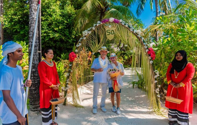 What keeps bringing them back? For Dr. Klein, it’s the perfect blend of relaxation and care. “Back in Switzerland, my job is to look after others. At Velassaru , I am the one being taken care of. Here, I am able to fully recharge my batteries, ” he says. From the moment they step off the plane, they feel the warmth of a place that truly speaks to them. This year’s golden anniversary was particularly special with a celebratory welcome at the airport, thoughtful gifts like a sun hat and golf shirt inscribed with special Dhivehi messages, and even their own golf buggy to get around the island.
