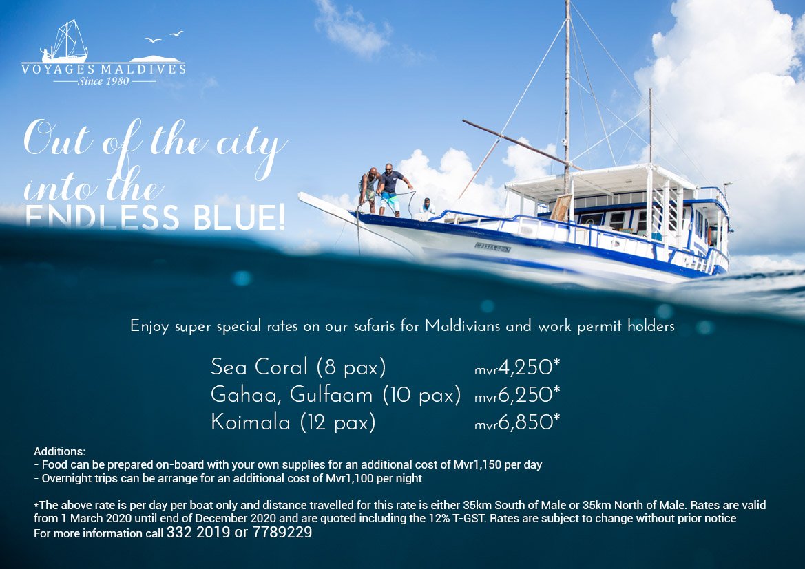 Take a break out of the city to the endless blues. Voyages Maldives is offering packages for Maldivians and work permit holders for a much needed getaway on safaris.